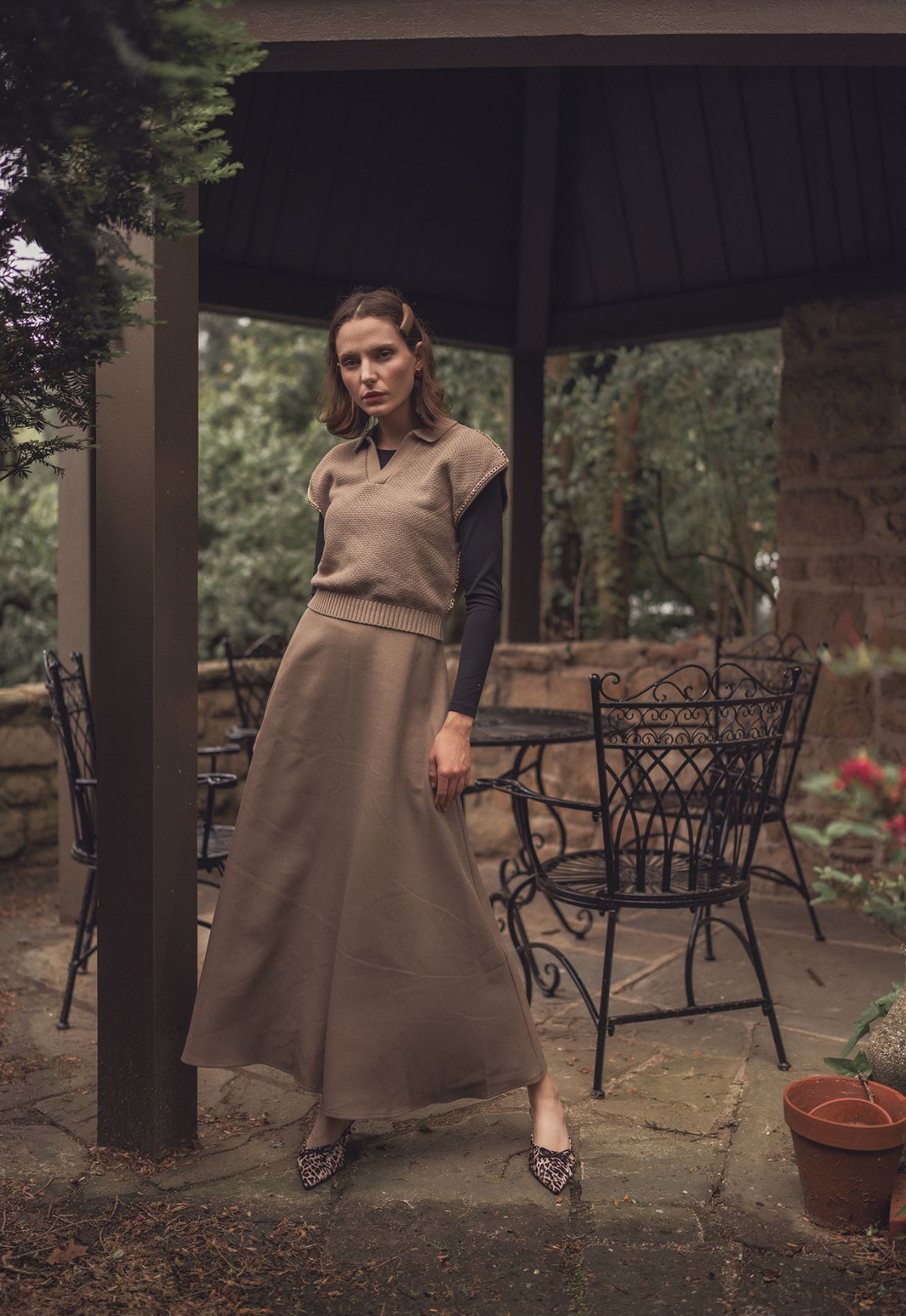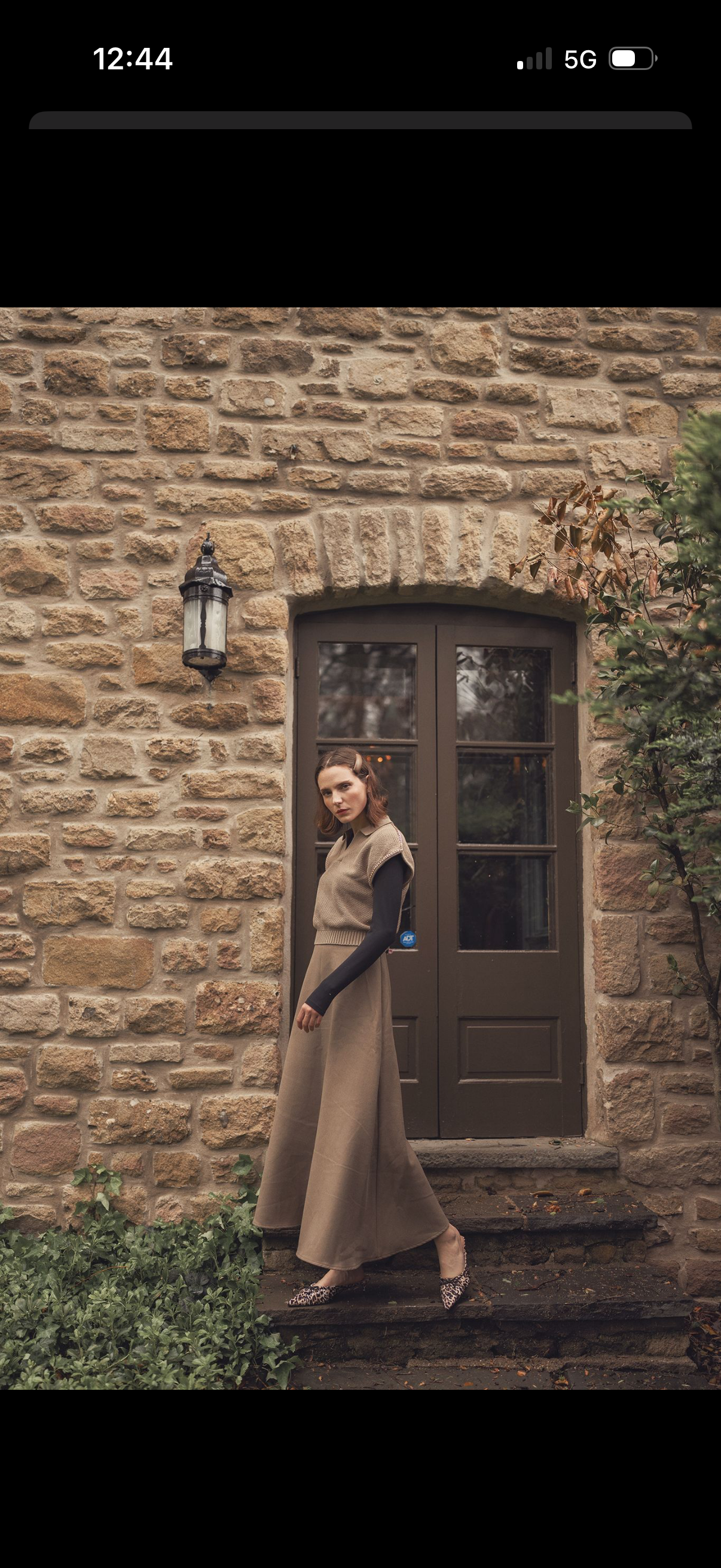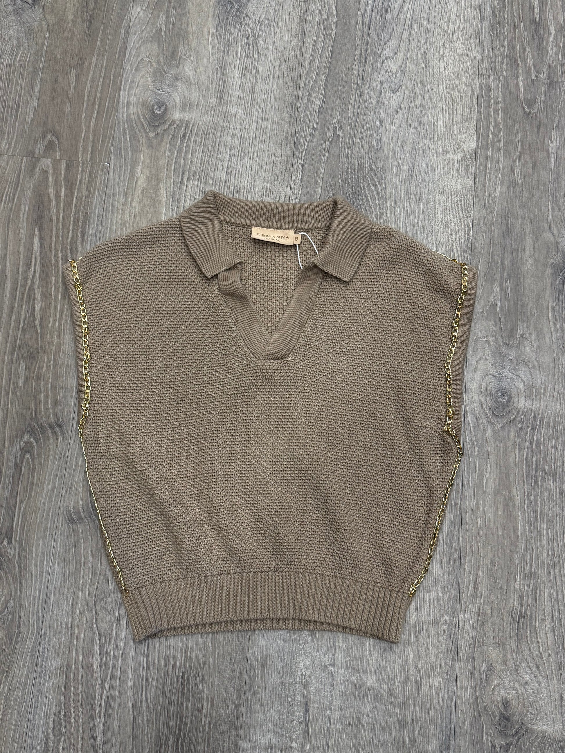 Add a touch of charm to your outfit with this soft brown knitted vest featuring a stylish collar and eye-catching gold chain details. Perfect for layering, it brings cozy warmth and a playful edge to any look. Whether dressed up or down, this vest is your new go-to for effortless style and a hint of sparkle.