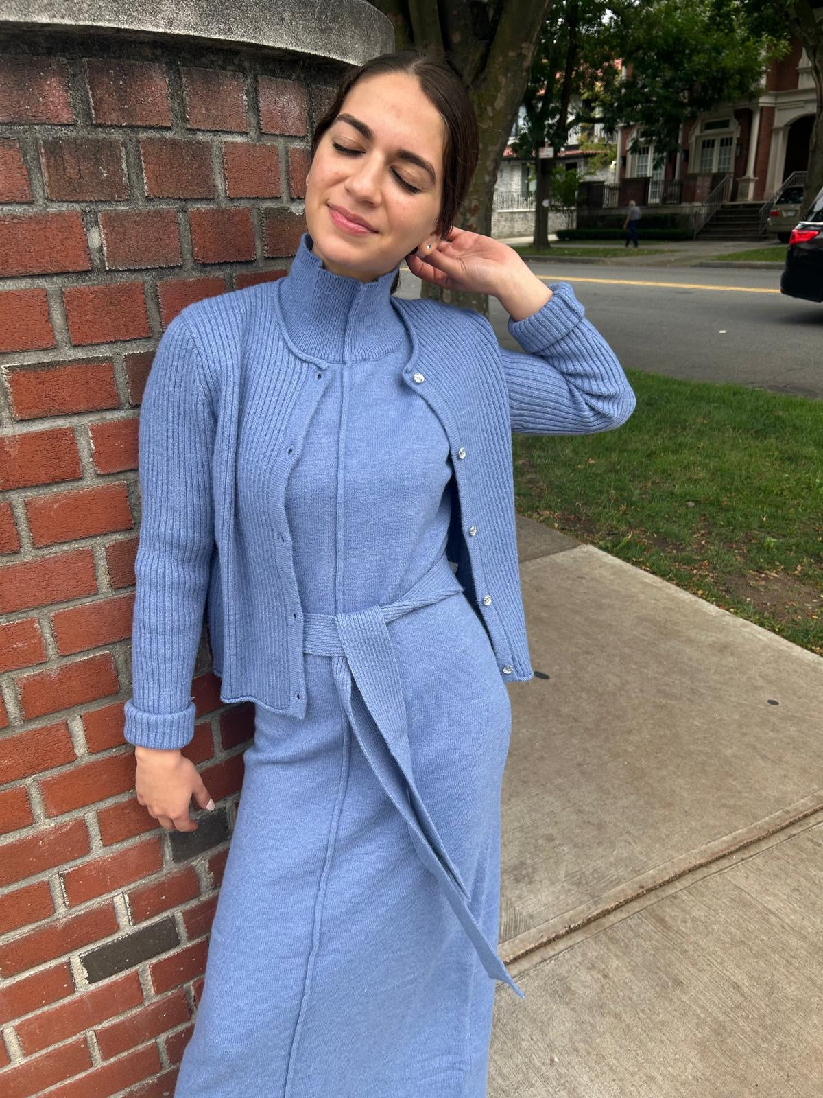 This charming dusty blue CONAN SET features a cozy jumper paired with a matching ribbed cardigan adorned with sparkling diamond button details. Perfect for adding a playful touch to any outfit, this set combines comfort and style effortlessly.