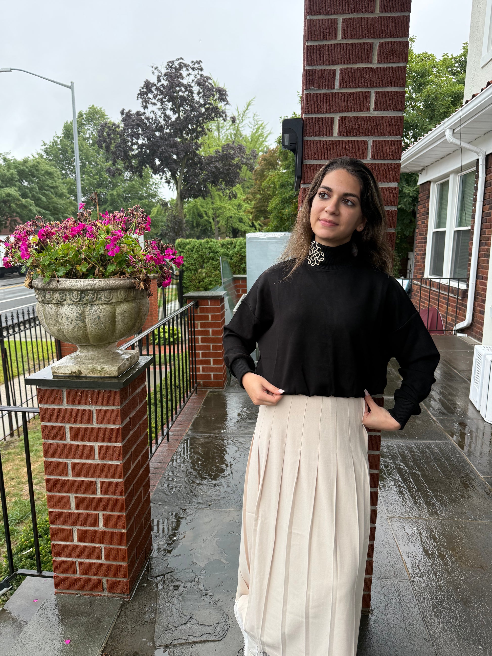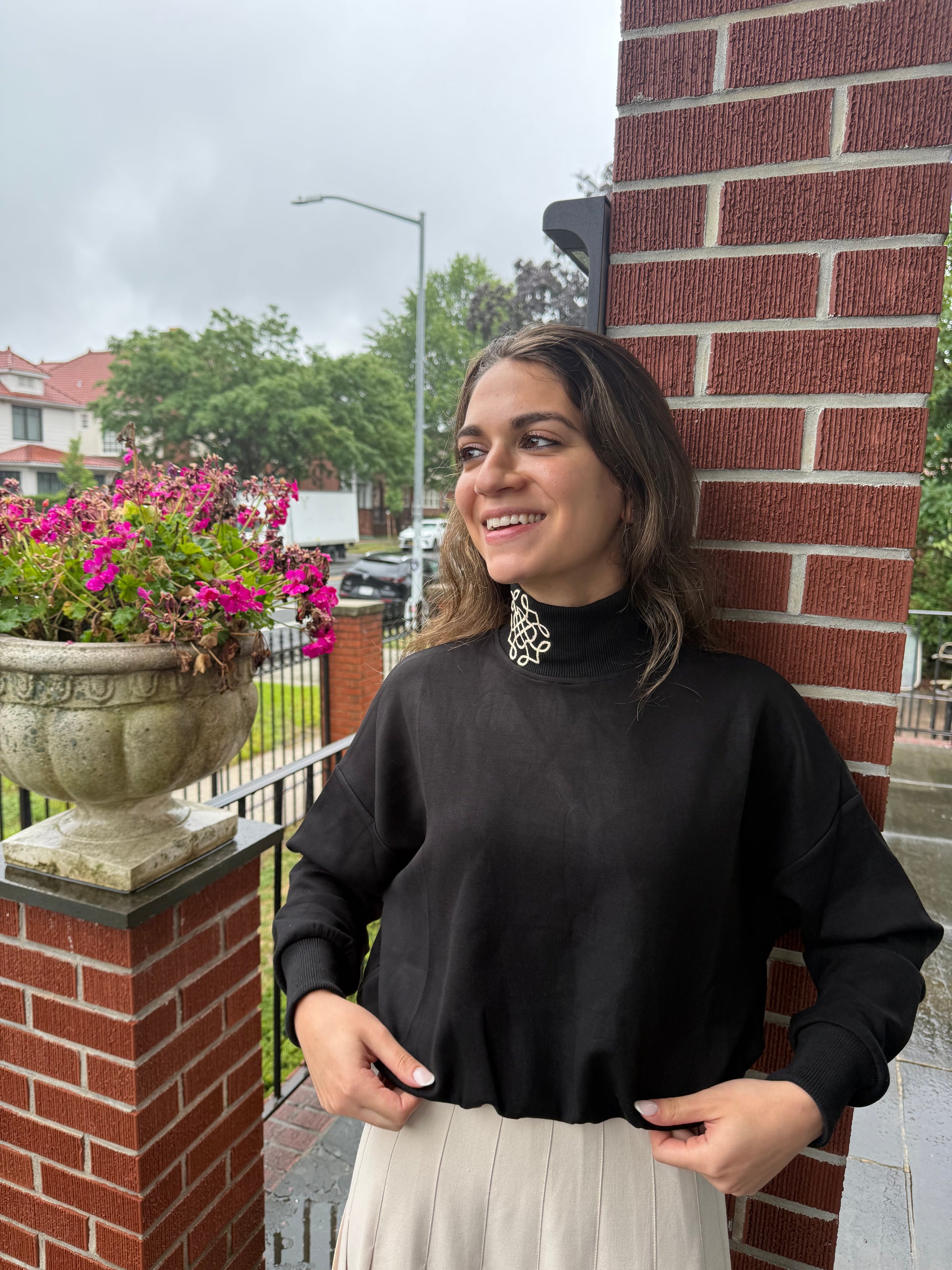 This black mock neck sweatshirt features an elegant embroidered design that adds subtle sophistication. The shirred elastic hem ensures a tailored fit, combining comfort with refined style—perfect for a polished yet relaxed look.