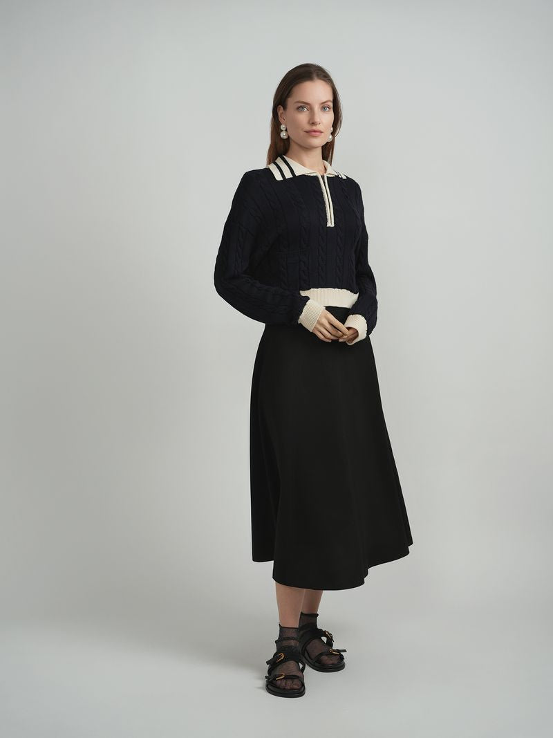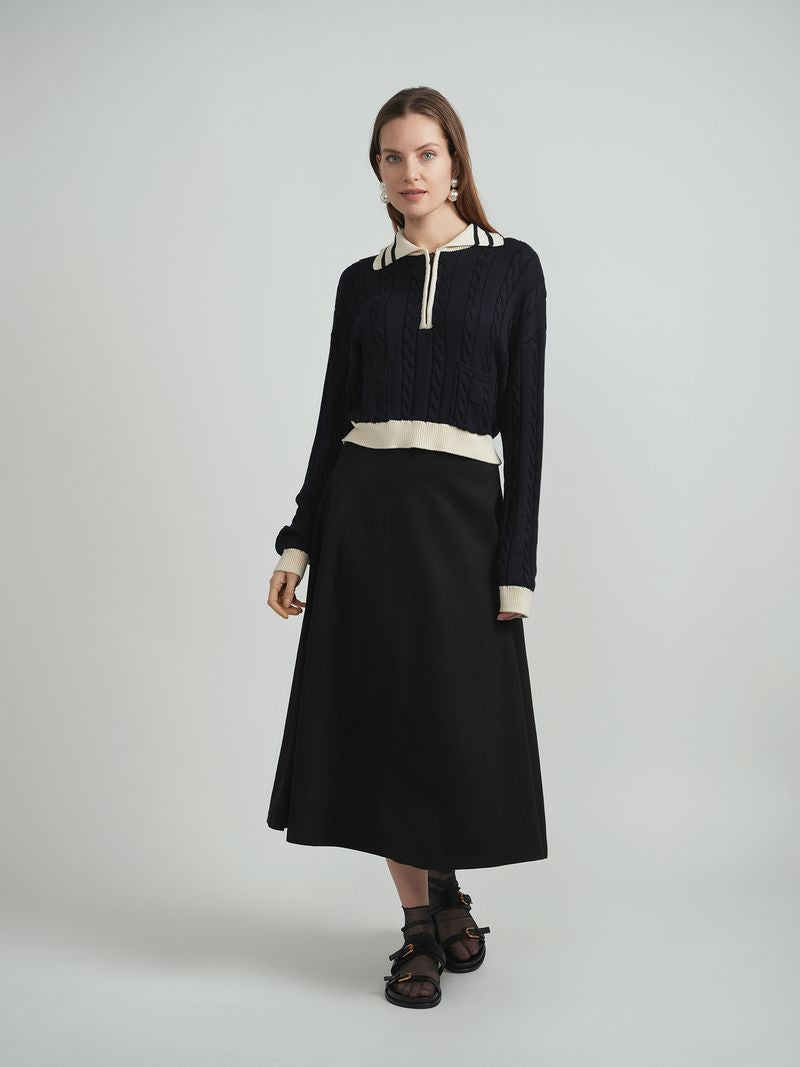 This Henley Cable Sweater features a refined foldover collar with a Henley zipper for effortless style. Crafted with a classic cable knit, it includes two front pockets for practical elegance. Its short length and tailored fit make it a sophisticated layering piece for any wardrobe.