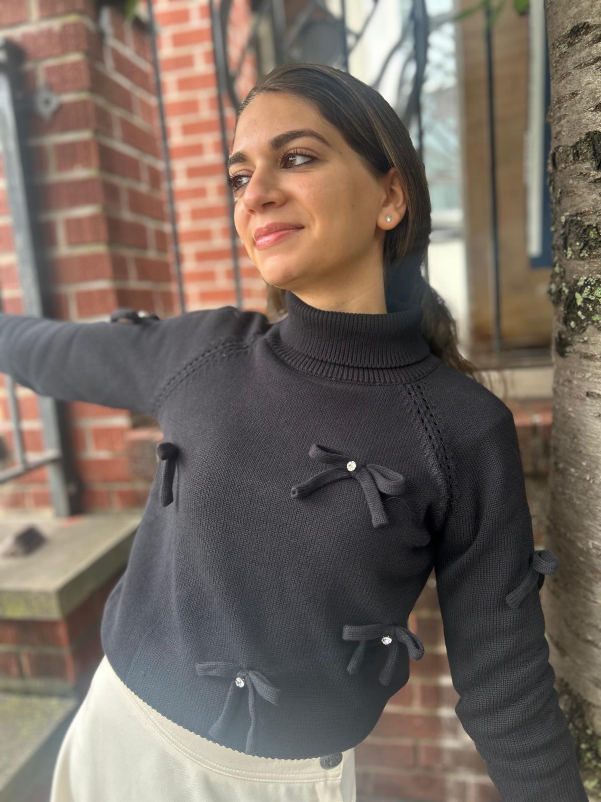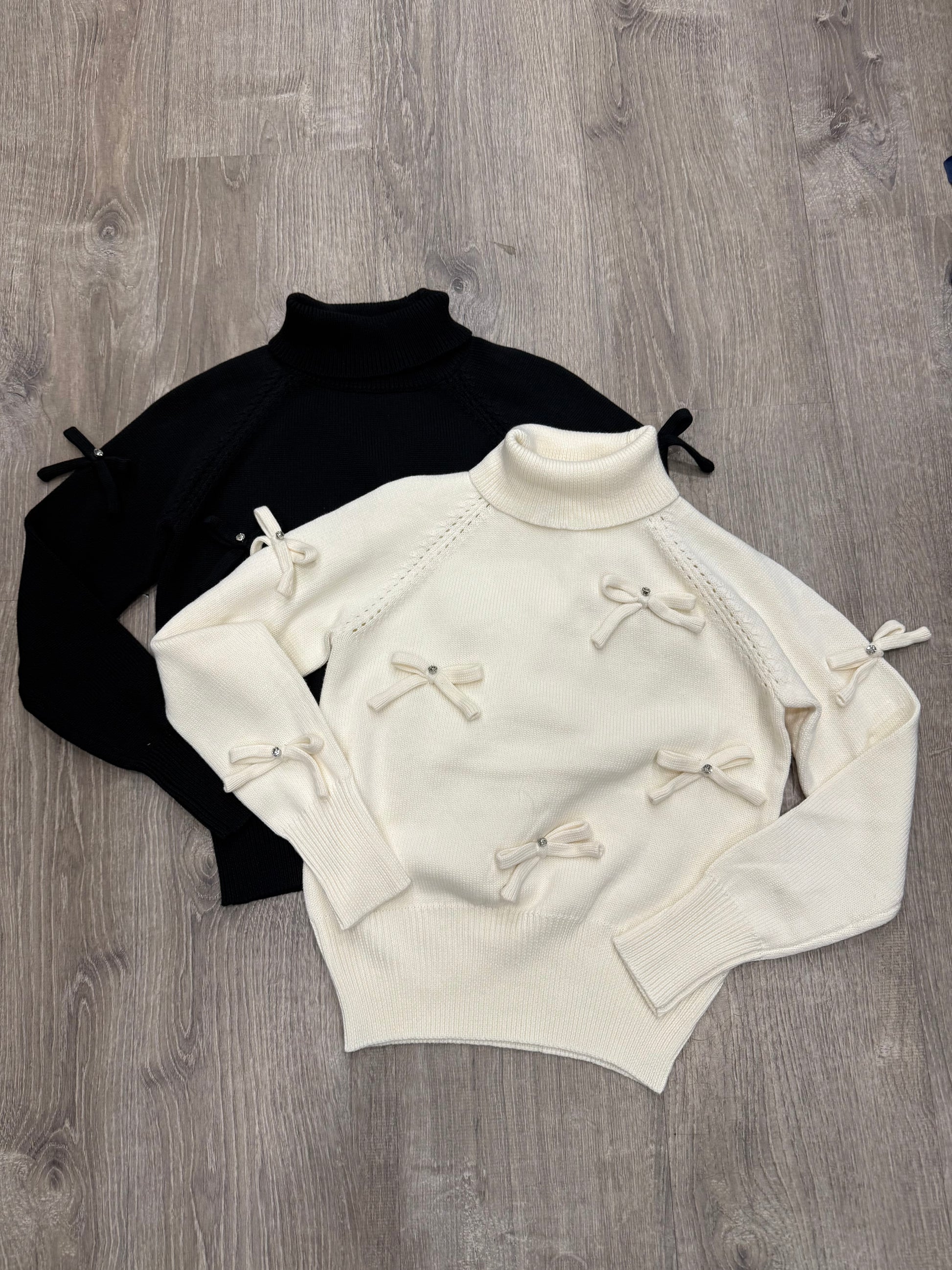 Cozy up in this playful knit top featuring a soft turtleneck design in classic black and ivory. Adorned with charming bows and delicate Diamond decals, it adds a touch of whimsy to your everyday look while keeping you comfortably warm, this sweater brings fun and flair to your wardrobe.