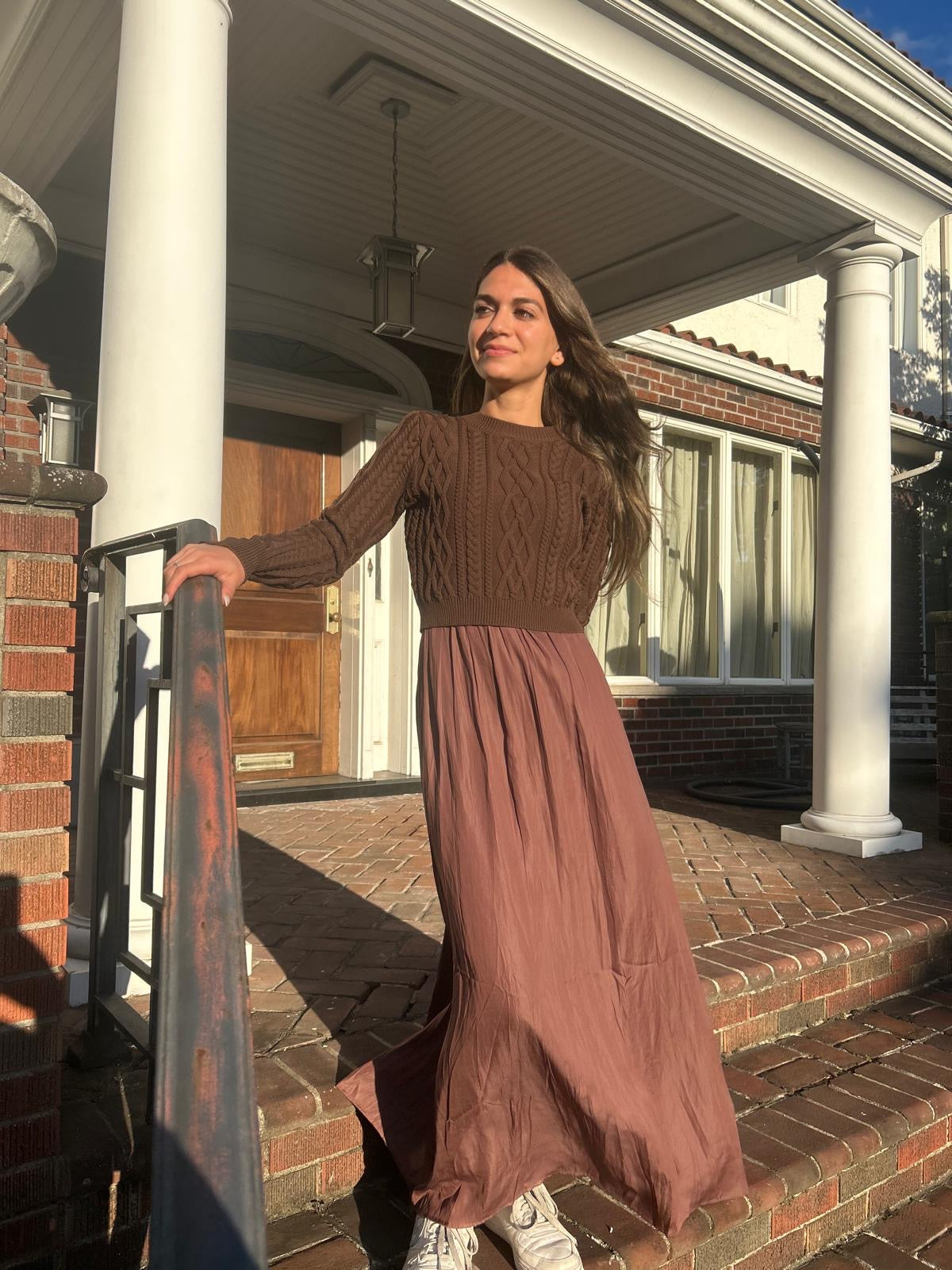 Elevate your wardrobe with the COCO MAUVE Set, featuring a cozy cable knit sweater paired with a delicate satin dress underlay. This harmonious blend of textures creates a refined yet effortlessly chic look, perfect for transitioning from day to evening. The soft BROWN hue adds a touch of sophistication, making it an ideal choice for both casual outings and special occasions. Enjoy comfort and elegance in one cohesive ensemble.