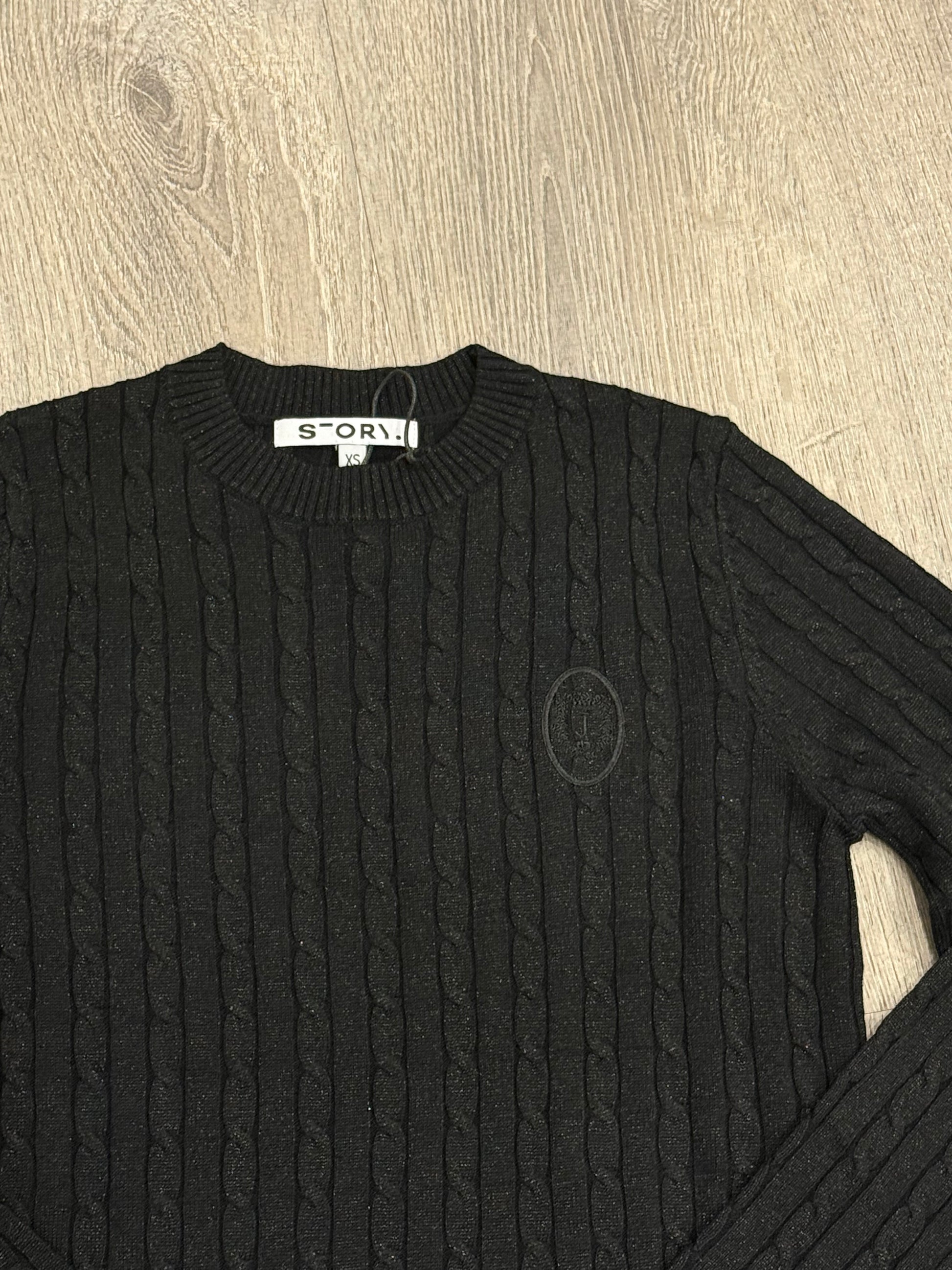 Add a touch of sparkle to your cozy wardrobe with this metallic cable knit crew neck. Featuring a classic cable knit pattern and a playful embroidered crest, it’s the perfect blend of comfort and charm for any casual day.