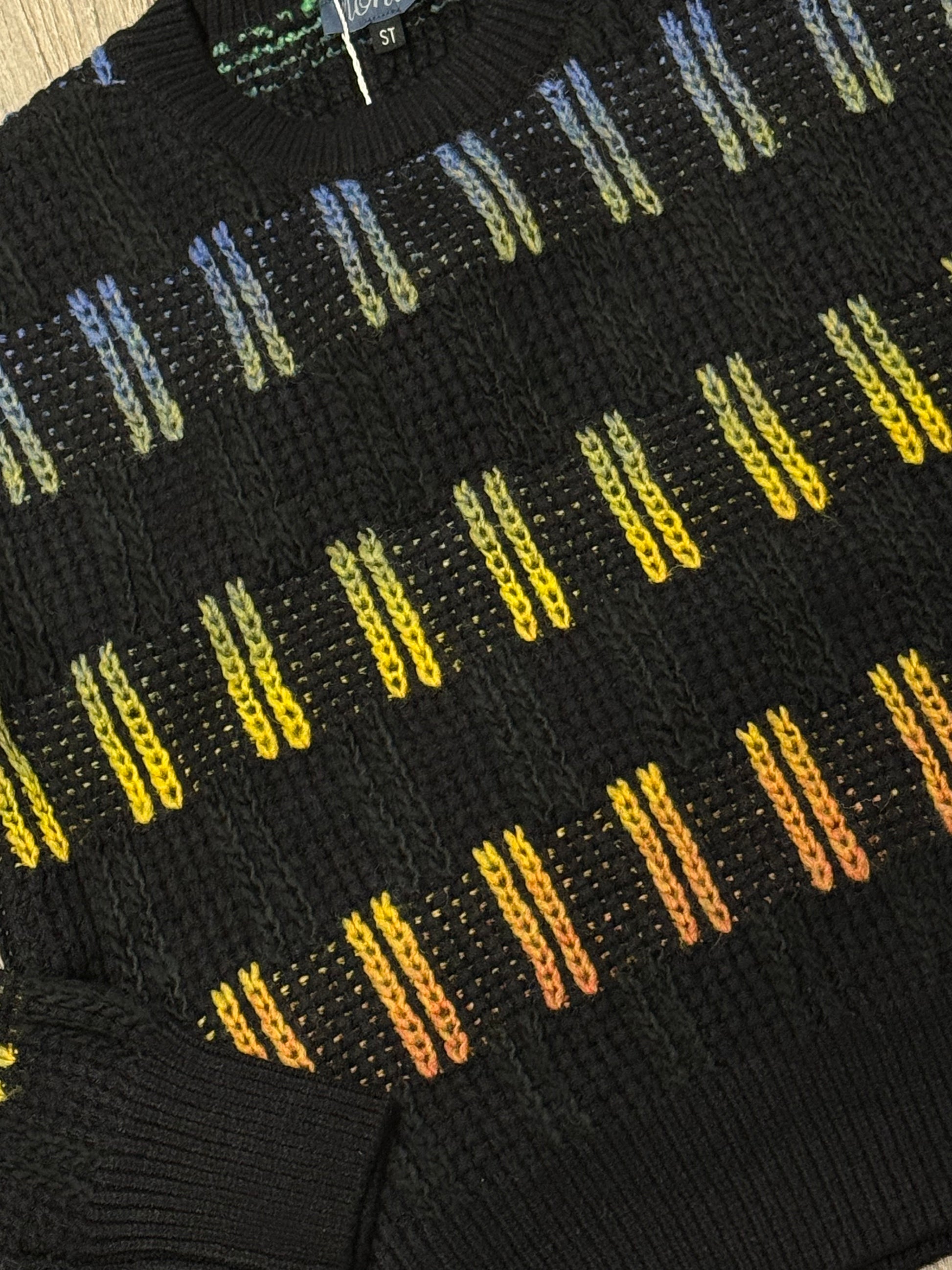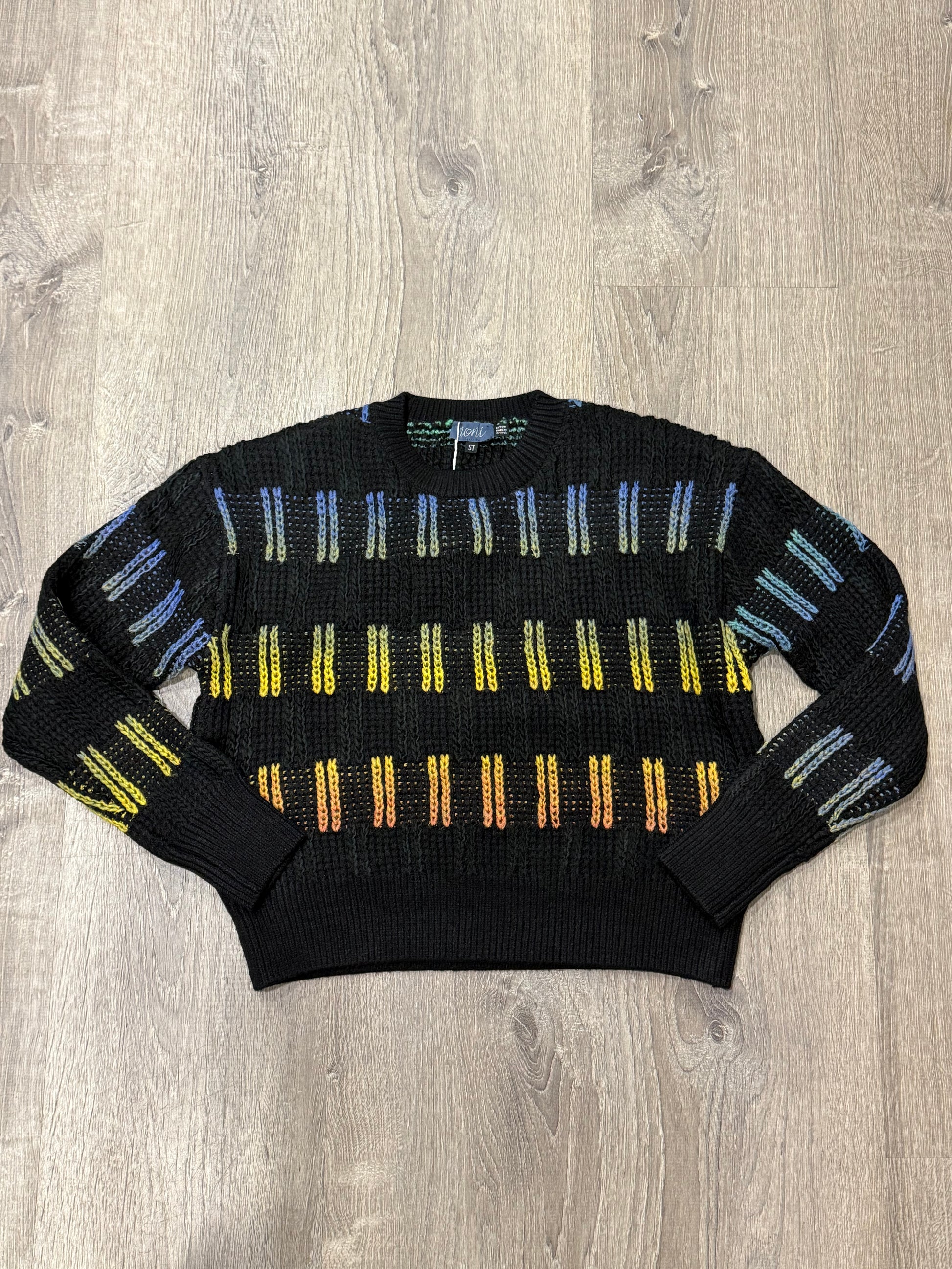 Stay cozy and stylish with this black knit sweater featuring playful peekaboo multicolor knit accents. Its cropped design adds a trendy touch, making it perfect for layering or wearing on its own. Comfortable and eye-catching, this sweater brings a unique flair to your everyday wardrobe.