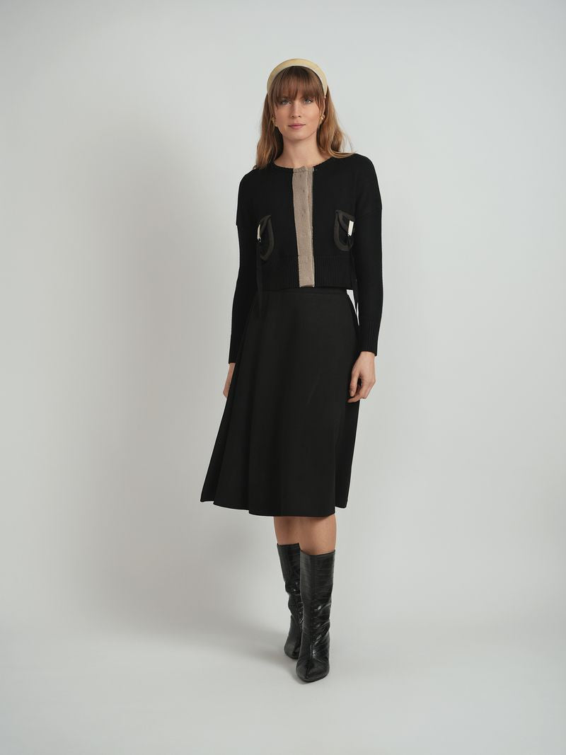 This refined black sweater features a sleek front button closure and two practical pockets, blending style with subtle functionality. Crafted for a polished look, it offers both comfort and elegance, making it an ideal choice for sophisticated everyday wear.