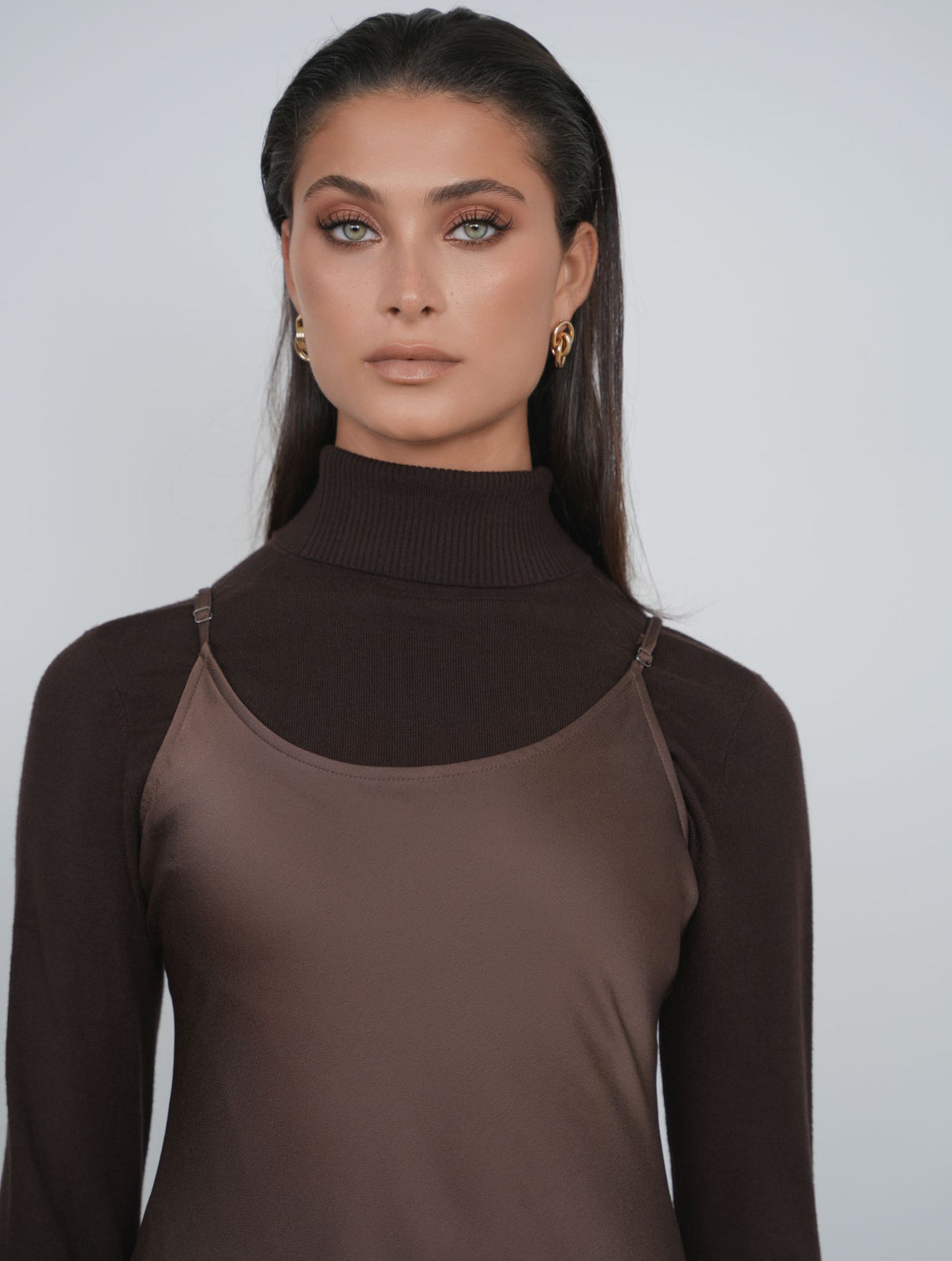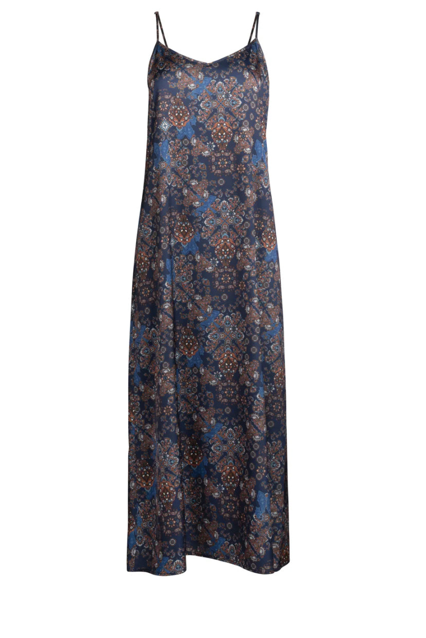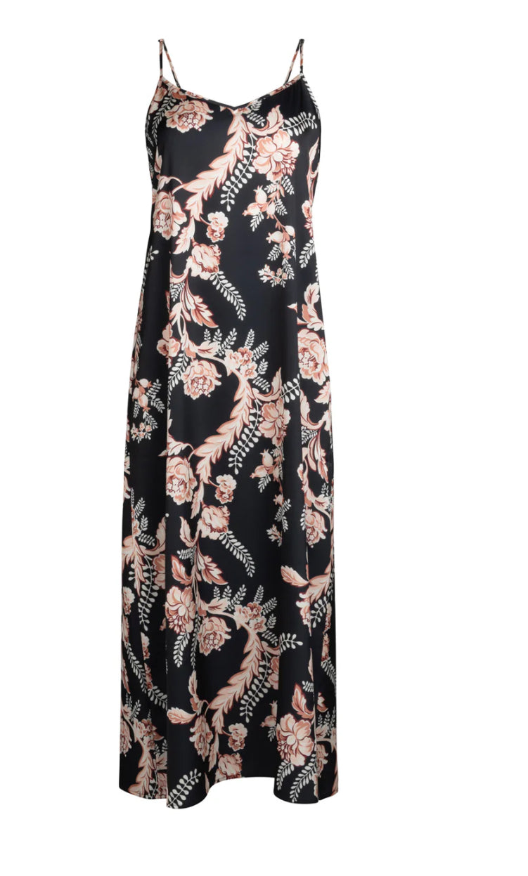 This POINT SATIN A-LINE SLIP DRESS features a flattering V-neckline and adjustable spaghetti straps for a customizable fit. Crafted from smooth satin, its maxi length and elegant A-line silhouette offer both comfort and refined style, perfect for formal occasions or sophisticated everyday wear. The delicate design combines ease of movement with a polished look, making it a versatile addition to any wardrobe.