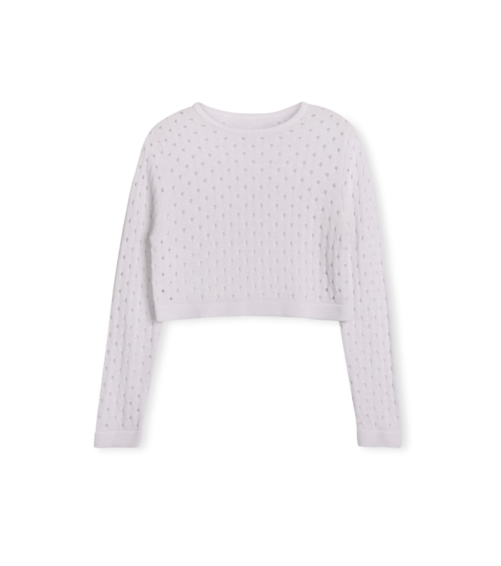 Elevate your style with our POINTELLE KNIT CROP TOP. This white knit pointelle crop sweater top features intricate detailing and a luxurious feel. Perfect for any occasion, this top adds a touch of sophistication to any outfit. Upgrade your wardrobe today.