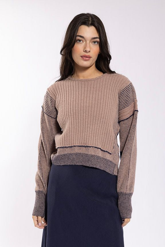 This ribbed patchwork sweater features a luxurious mauve base accented with navy peek-through details, creating a refined color contrast. Crafted from super soft fabric, it offers both comfort and elegance, making it an ideal choice for a sophisticated, stylish look.