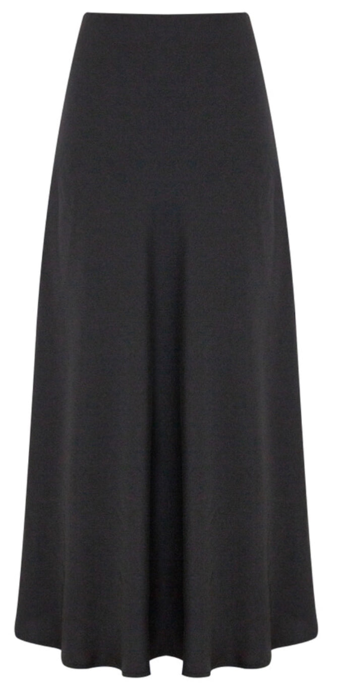 Elevate your wardrobe with the Aline slip maxi skirt in sleek black. Crafted for a graceful silhouette, this skirt drapes effortlessly, offering both comfort and refined style. Its minimalist design makes it a versatile piece, perfect for sophisticated daywear or elegant evening occasions.