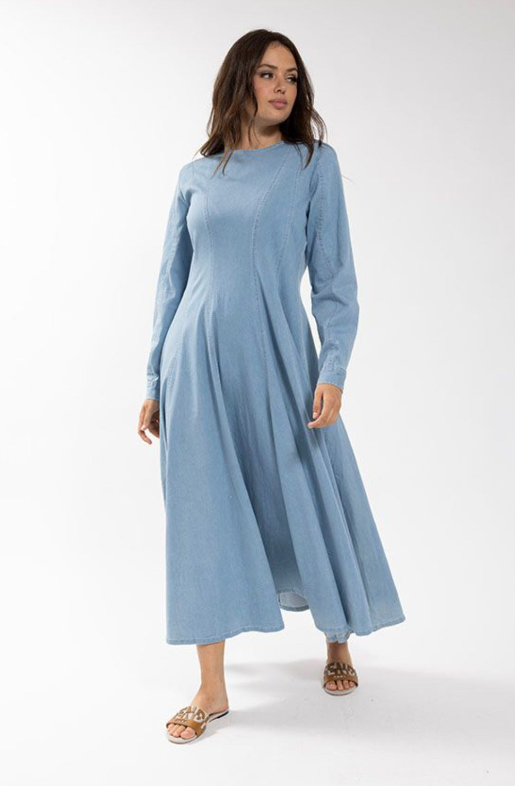 This denim dress features intricate seam detailing and a convenient back zipper. With its comfortable fabric and stylish design, it's the perfect choice for any casual occasion. Upgrade your wardrobe with this versatile and effortlessly chic dress.