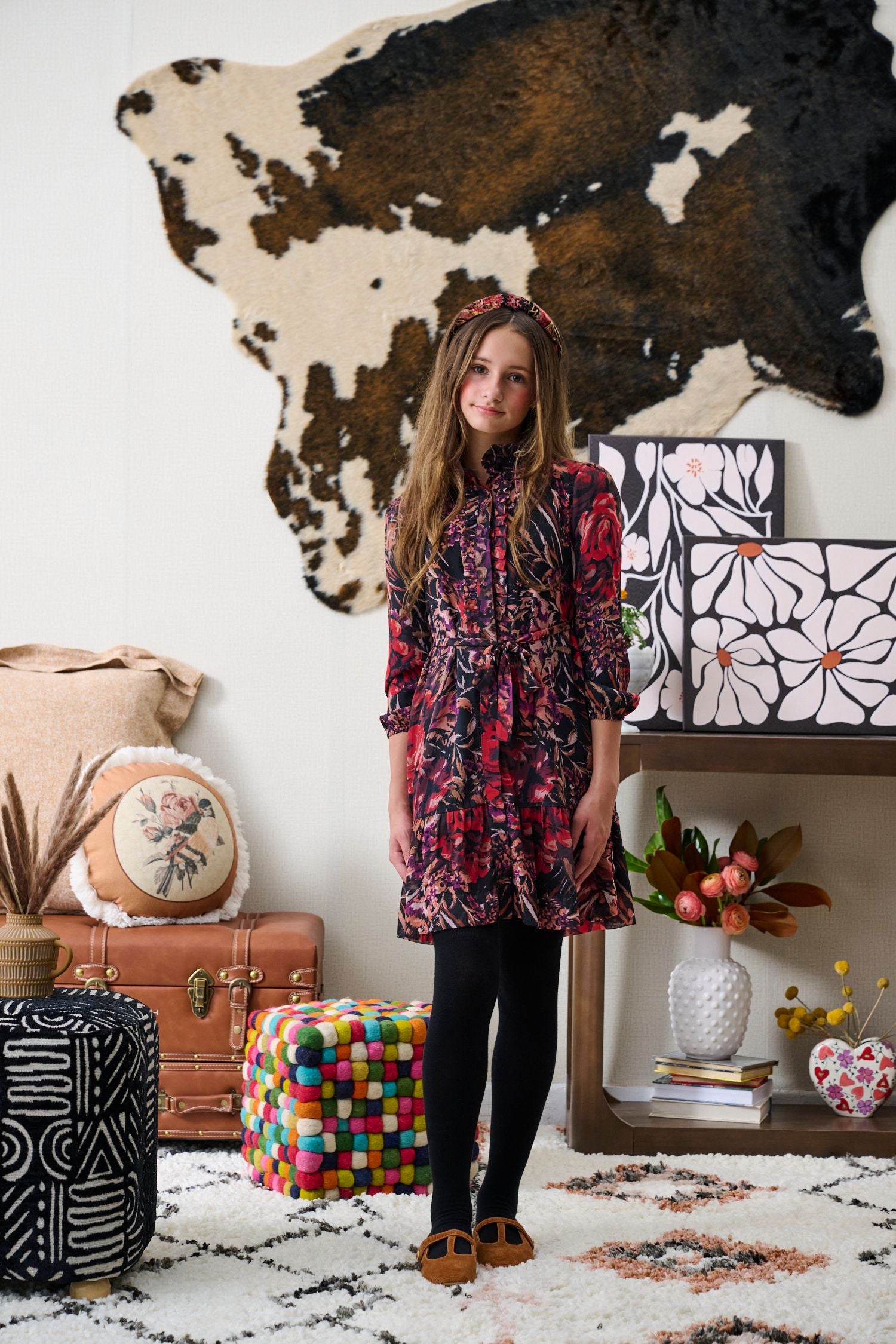 The Amber Dress features a delicate multicolor chiffon fabric that drapes gracefully, enhanced by a ruffled front for an elegant silhouette. Its button-down closure offers a refined touch, while the matching belt cinches the waist to flatter your shape. Perfect for sophisticated occasions, this dress combines lightweight comfort with timeless style.