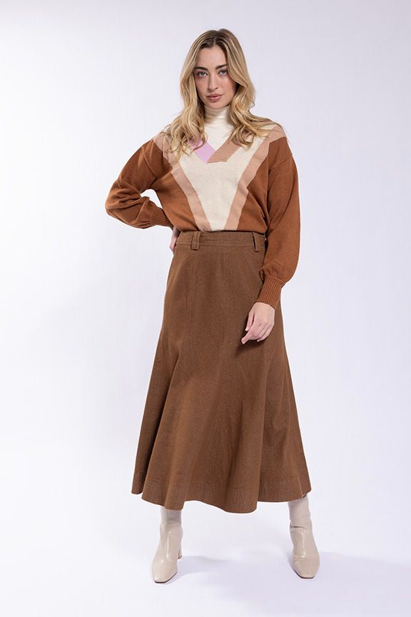 This brown denim skirt features a flattering A-line flare bottom that adds movement and style. Detailed with stitched hem design and belt hoops, it offers both a polished look and practical wearability. Perfect for creating versatile outfits, this skirt combines classic denim durability with thoughtful design elements to support your everyday wardrobe needs.