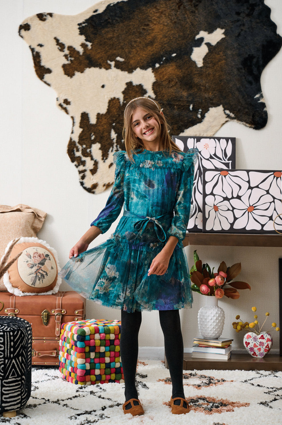 The Jade Dress features an elegant abstract green tulle design, with delicate ruffle details accentuating the shoulders and neckline. A matching tulle belt cinches the waist, creating a refined silhouette perfect for sophisticated occasions.