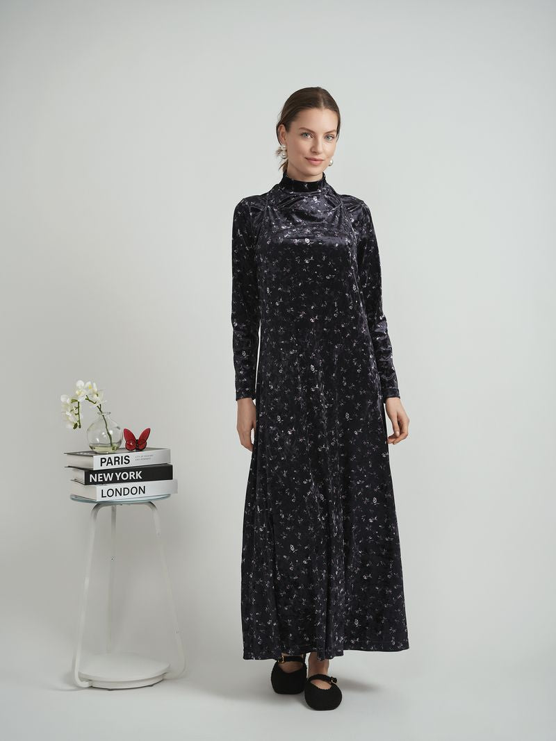 This velour matching set features a charcoal black background adorned with elegant purple flowers. The top offers a comfortable mock neck design, while the maxi jumper is sleeveless, providing a graceful and relaxed fit. Perfect for those seeking both style and comfort in one coordinated outfit.